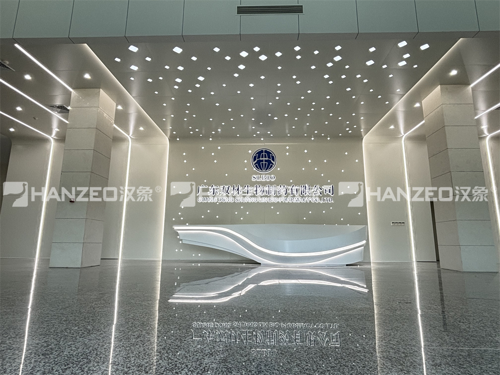 4、在入口及核心区域,突出“双林生物”品牌标识与企业愿景,结合灯光与材质搭配,营造出专业、严谨、可信赖的制药企业形象。
